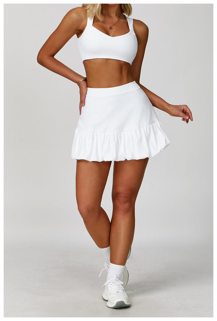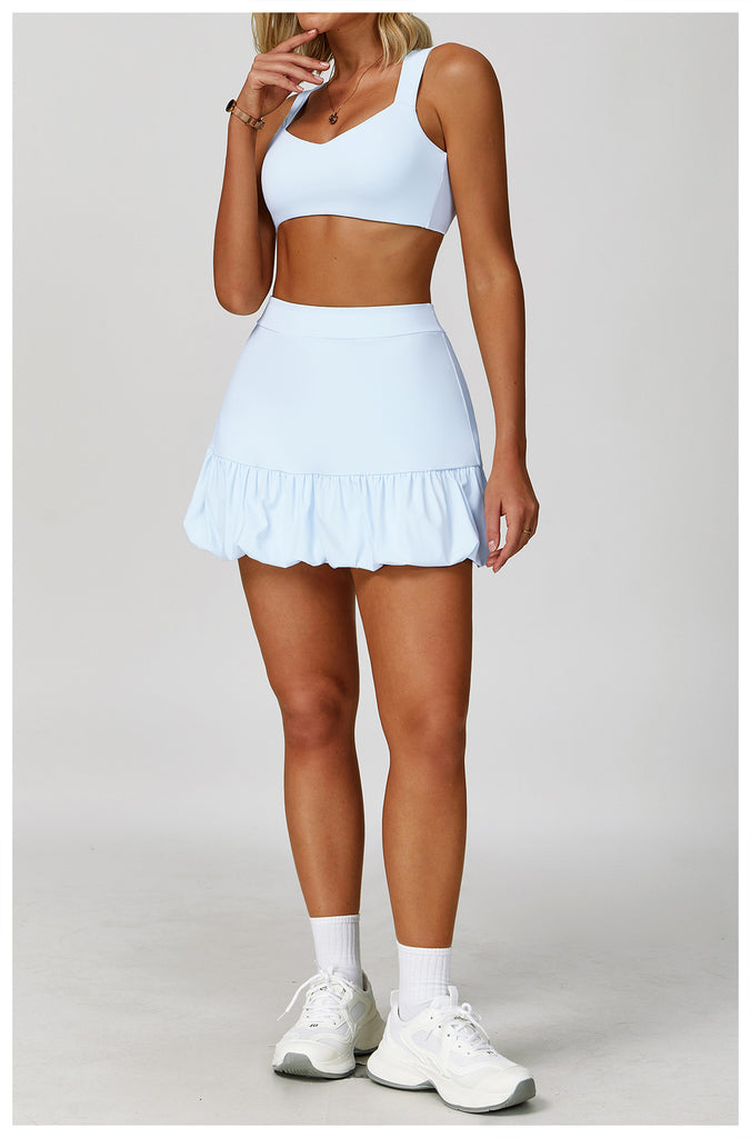 Pair with a ruffled tennis skirt or matching sculpt leggings for a studio-to-street look. Add gold hoops and a sleek ponytail to take this crop from sweat sesh to social hour.