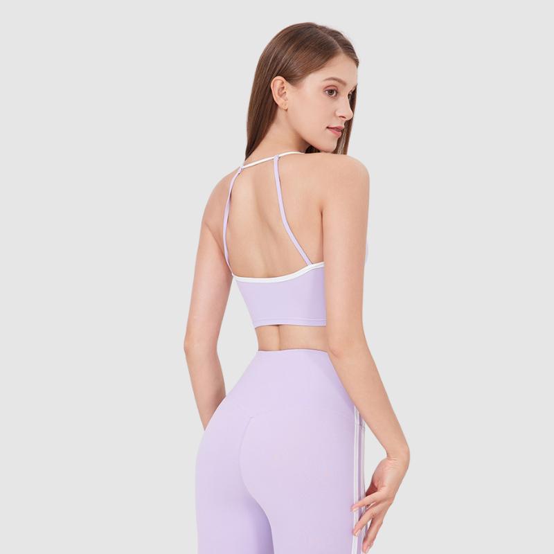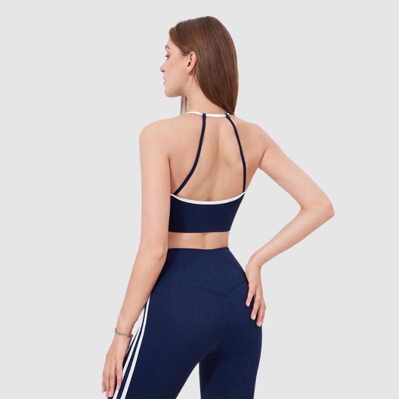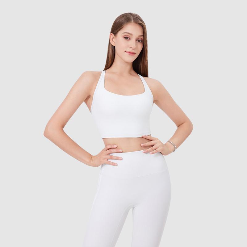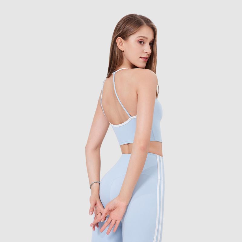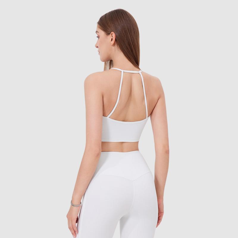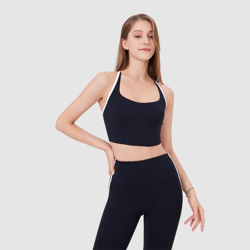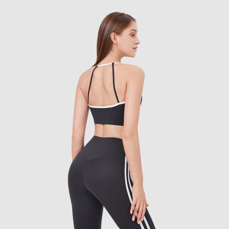 This sports bra with white accent straps is designed to bring both style and function to your activewear collection. Featuring a scoop neckline, contrasting white trim, and a racerback design, it offers a flattering fit and enhanced mobility. Made with moisture-wicking, high-stretch fabric, this bra keeps you comfortable and supported during workouts or casual wear.