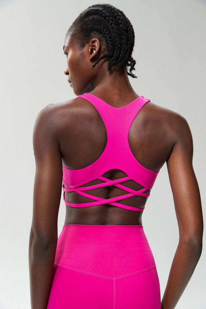 From mat to matcha, the Strappy Back Racer Bra combines a sleek scoop front, supportive racerback, and bold criss-cross straps for breathable comfort and striking style.