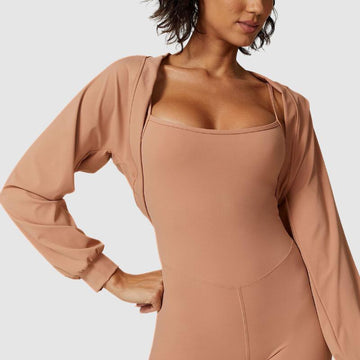 Layer this cape jacket over a fitted crop top and high-waisted leggings for a polished gym-ready look. For casual outings, pair it with joggers, sneakers, and a crossbody bag. Its cropped length makes it ideal for highlighting your favorite activewear pieces while maintaining a chic, sporty aesthetic.