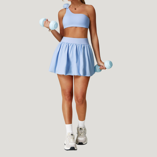 - Style Tip: Pair with the matching one-shoulder rosette top or bra for a powerful monochrome look. Add sleek sneakers or ballet-inspired slides to complete the set.