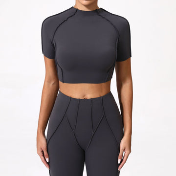 ✓ Cropped athletic top with high crew neckline for secure, sleek coverage
