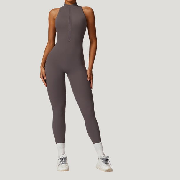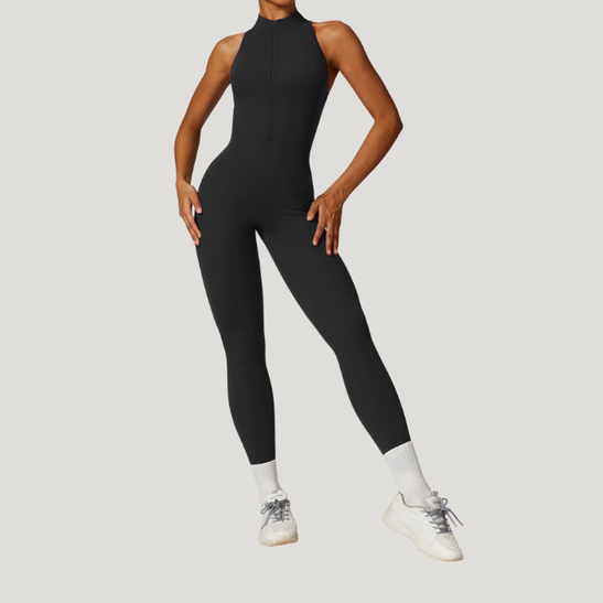 - High neckline with zip-up front for adjustable coverage and a sporty, modern look