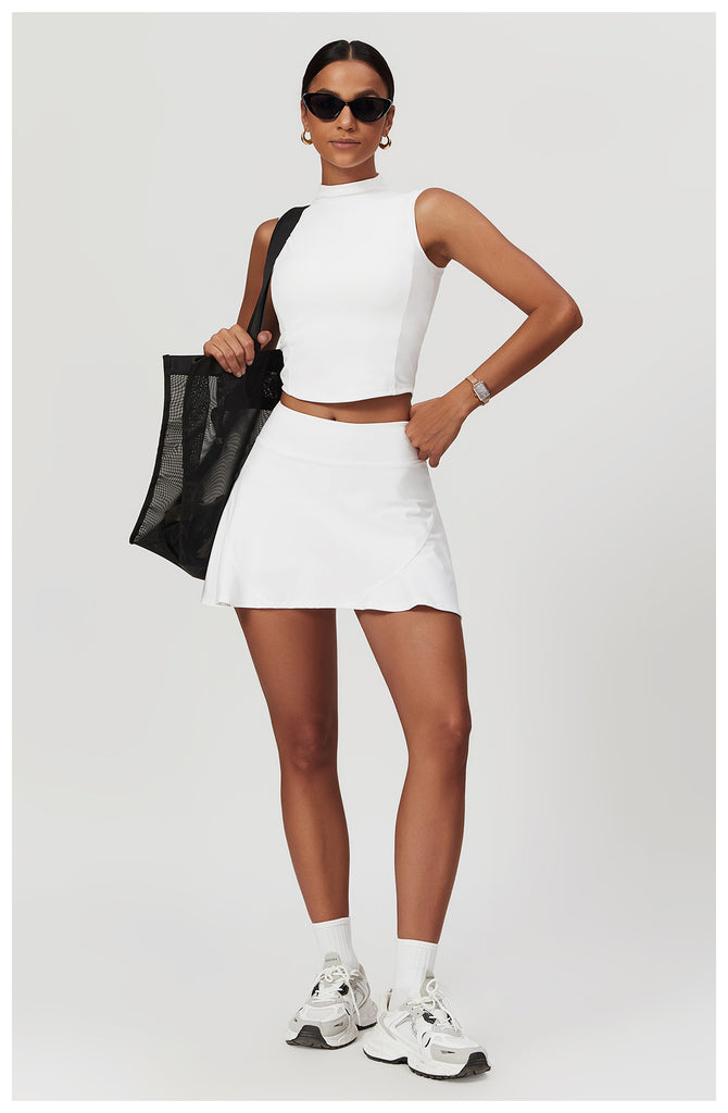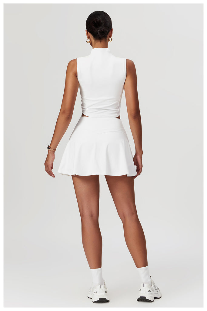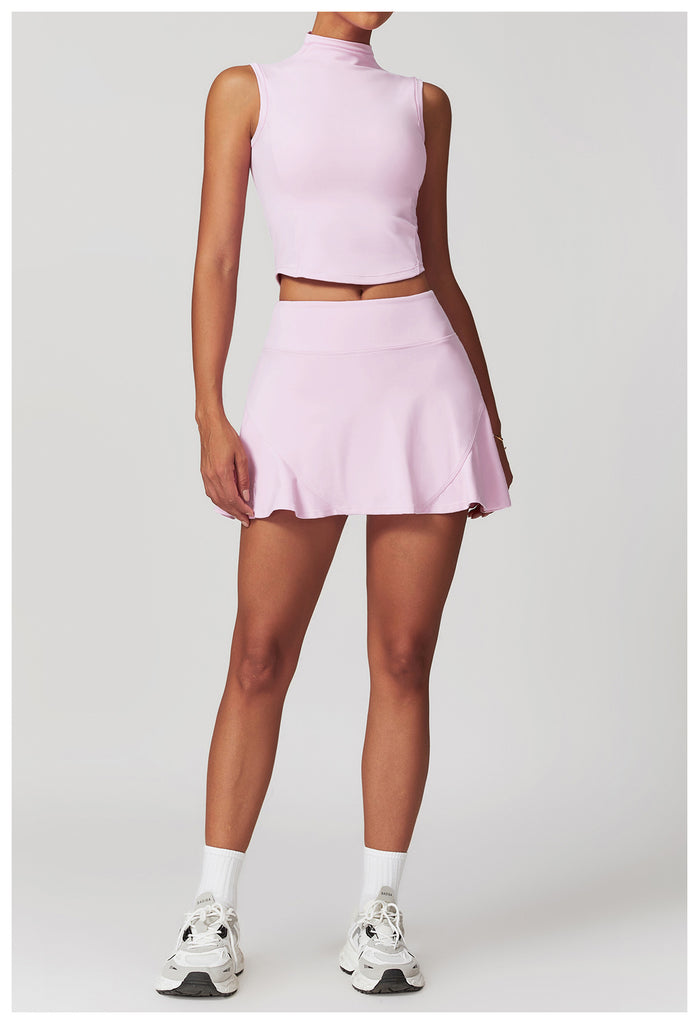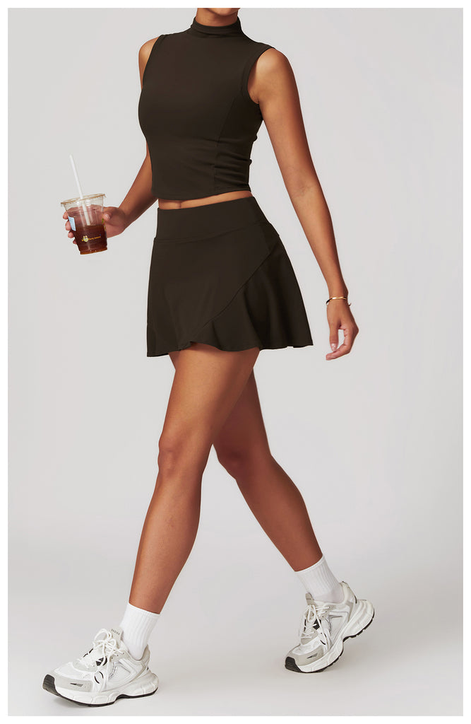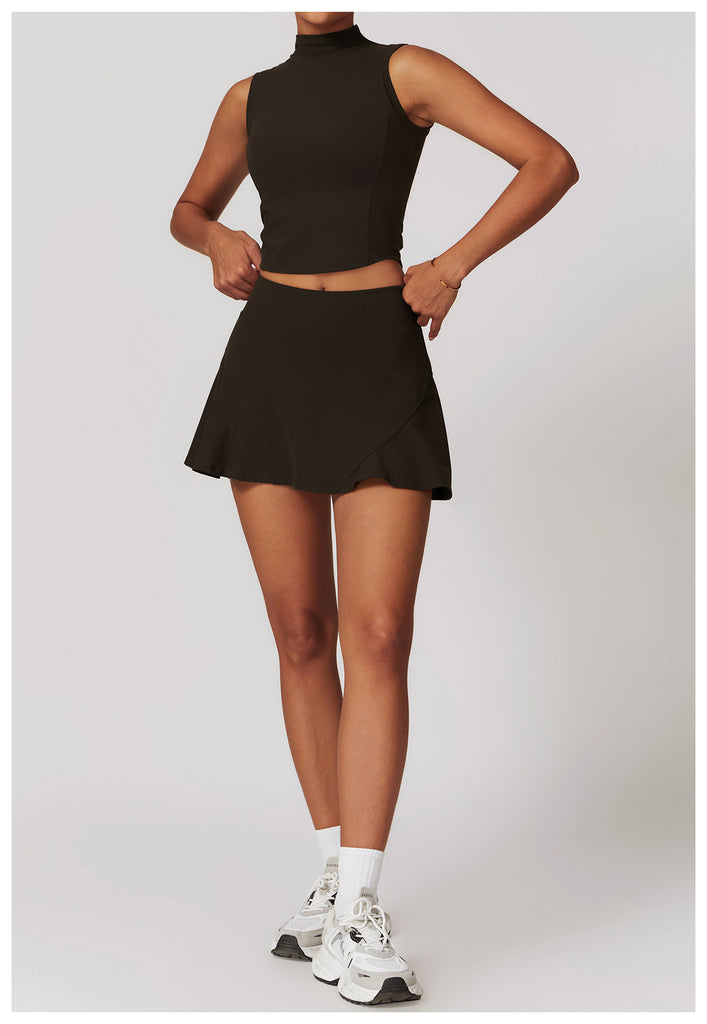 This sleeveless skirt set serves clean lines and effortless polish, blending a tailored silhouette with functional comfort. The high-neck crop top offers sleek, minimalist coverage while the matching skirt flows with a subtle flare—perfect for courtside confidence or weekend errands in style.